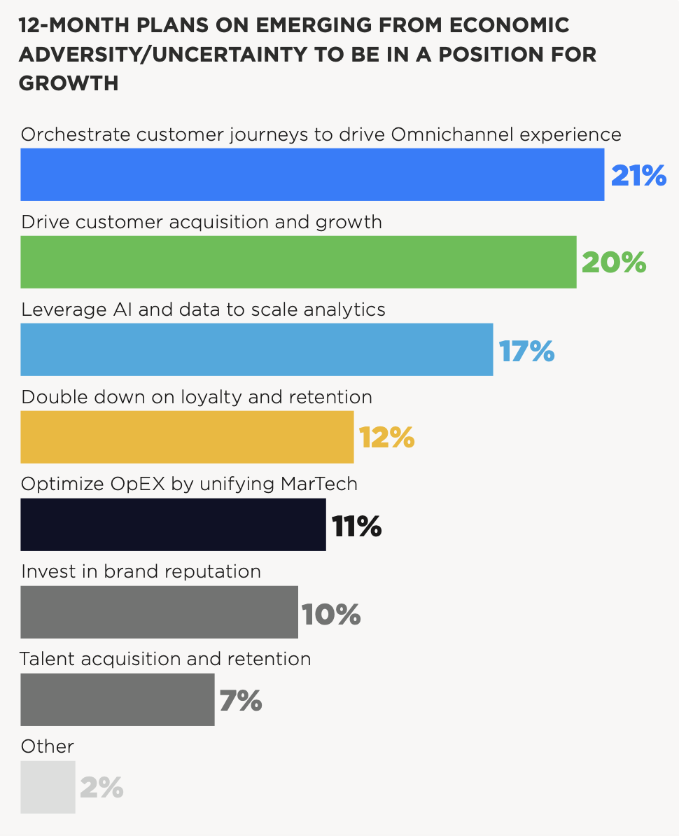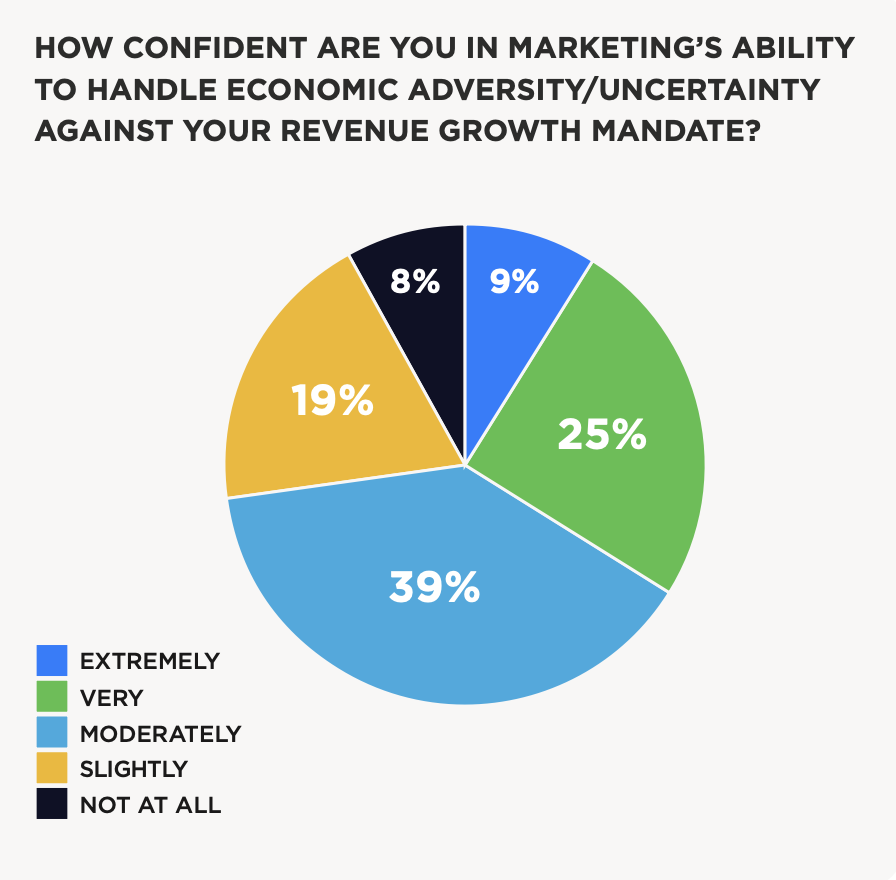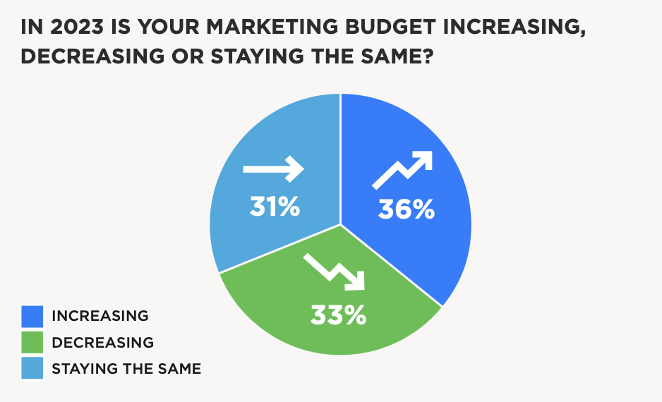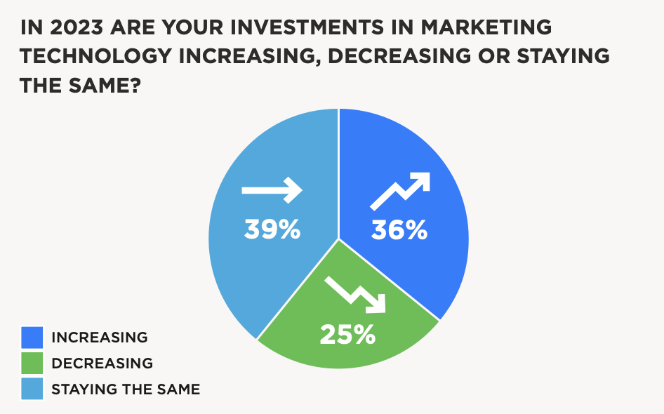 Though some marketing leaders lack confidence in dealing with economic uncertainty, deep budgets cuts are less of a concern, according to the report. Thirty-six percent of marketing budgets are increasing, compared to 33 percent decreasing and 31 percent staying the same. Similarly, martech investments are increasing for 36 percent of respondents.