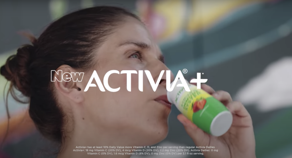 “Because of the pandemic, almost 30 percent of consumers are consuming more functional foods and beverages—and the probiotics category has benefited a lot from that tailwind,” says Kallie Goodwin, Vice President of Family & Wellness Brands at Danone NA. So when it came time to launch its new probiotic-packed product, Activia+, the brand leaned into immunity as a hook.