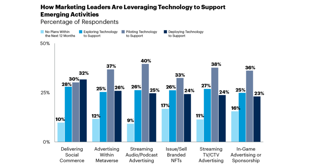 In terms of new types of technology investments to support innovation, the survey found that streaming audio or podcast advertising was on the rise, with 65 percent of respondents saying they have deployed this technology or have already done so. Other tools include advertising within the metaverse (63 percent), social commerce (62 percent), streaming TV or CTV advertising (62 percent), in-game advertising (59 percent) and creating branded NFTs (57 percent).