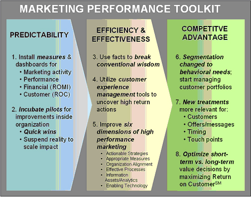 Managing marketing performance is all about creating a customer- and data-driven discipline in your organization, enabled with the right tools and information when needed, measured in such a way that every one in the marketing organization who makes decisions gets immediate feedback as to whether their decisions created or destroyed customer value, and generated or reduced return on marketing investment