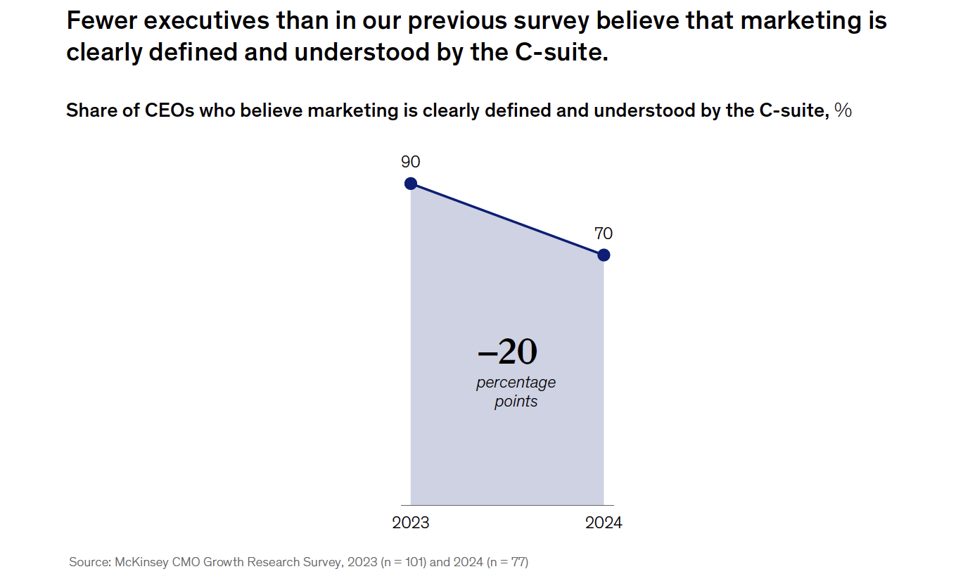 “CMOs have all these amazing customer metrics and everything’s measurable, and it’s almost overwhelming for the CEOs and the C-suite to be able to grasp it,” said McKinsey partner and report co-author Robert Tas. “Marketing is certainly trying to do the right things. And I think as we talk to CMOs, they all think they’re connecting the dots, but when it translates up top, it loses some of its applicability to the business metrics.”