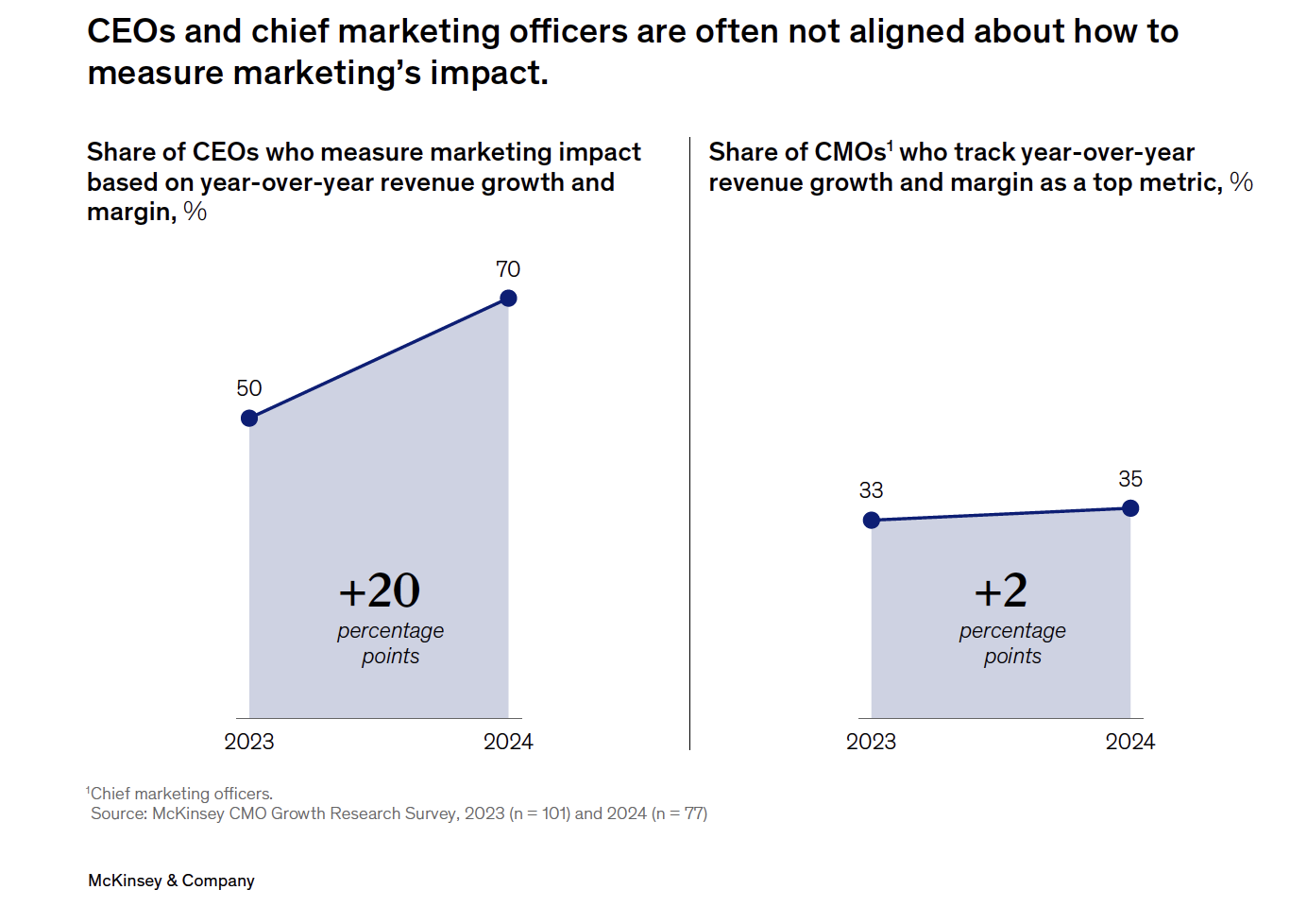 - The metrics delivered by CMOs are not those that are preferred by CEOs. While 70% of CEO respondents measure marketing’s impact based on year-over-year revenue growth and margin, only 35% of the CMOs surveyed track this as a top metric.