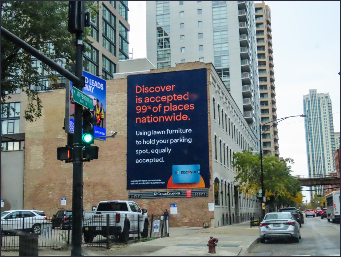 JM: There are certain things that are very unique to a particular market. For example, there is an out-of-home billboard that talks about how Discover is accepted 99% of places and that it’s also acceptable to save your parking spot with a lawn chair—which is very much a Chicago thing. If you’re from Chicago, that’s something you identify with, especially as we’re headed into the colder season. There’s also unique lines about different preferences for pizza in different markets, and things that are specific to the culture in New York, Los Angeles, D.C. and some of the other markets we’re going to be showing up in. And some of it is place-based, too. The ads might be in conjunction with a gym or a certain type of payment opportunity, and so it’ll speak to that moment of relevance.