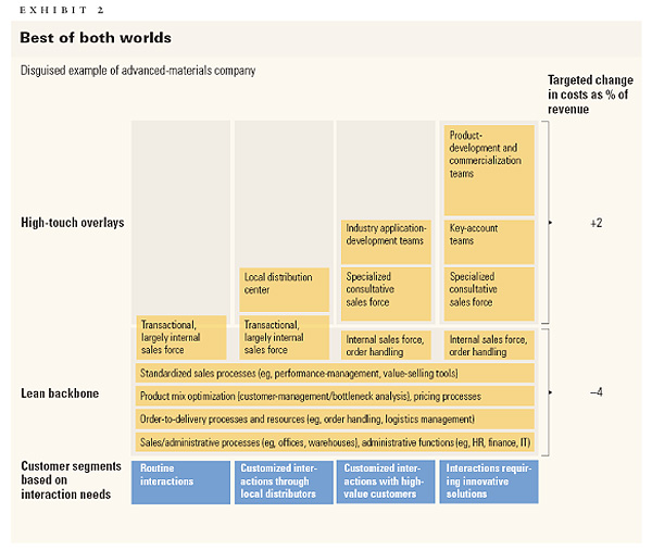 Nevertheless, there are companies dealing with this successfully. What sets them apart is a new, modular approach to sales and service: segmenting customers, based on what they want from the sales interaction; creating a “lean backbone” to handle the majority of interactions; and finally adding high-touch overlays in the customer segments that require them. This approach drives down overall costs, boosts success in priority segments, and provides a dashboard to guide investments.