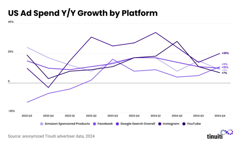 - Facebook grew its ad dollars from Tinuiti clients 11% from the previous fourth quarter, its largest year-over-year growth since Q3 2023. The platform continued to account for the majority of ad spend on Meta, 64%. Though Instagram brought in only 35% of Meta’s ad money, it enjoyed a 20% jump in year-over-year ad dollars for the fourth quarter. Much of that increase was due to the continued growth of Reels inventory.