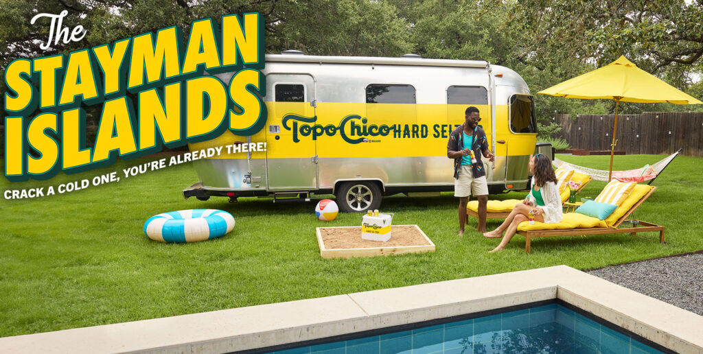This summer Topo Chico Hard Seltzer partnered with Airstream to deliver an upgraded staycation experience, void of the stresses often caused by planning, packing and traveling to a far-flung destination. One contest winner will enjoy a three-day, two-night experience at “The Stayman Islands”—their own backyard, transformed into a vacation destination with sand, plush lounge recliners, a massage, a chef-curated dinner, live musical entertainment and, naturally, a private Airstream trailer to sleep in. We spoke with Brittany Norris, Marketing Director of Hard Seltzers at Molson Coors, about the inspiration and marketing strategy behind the activation.
